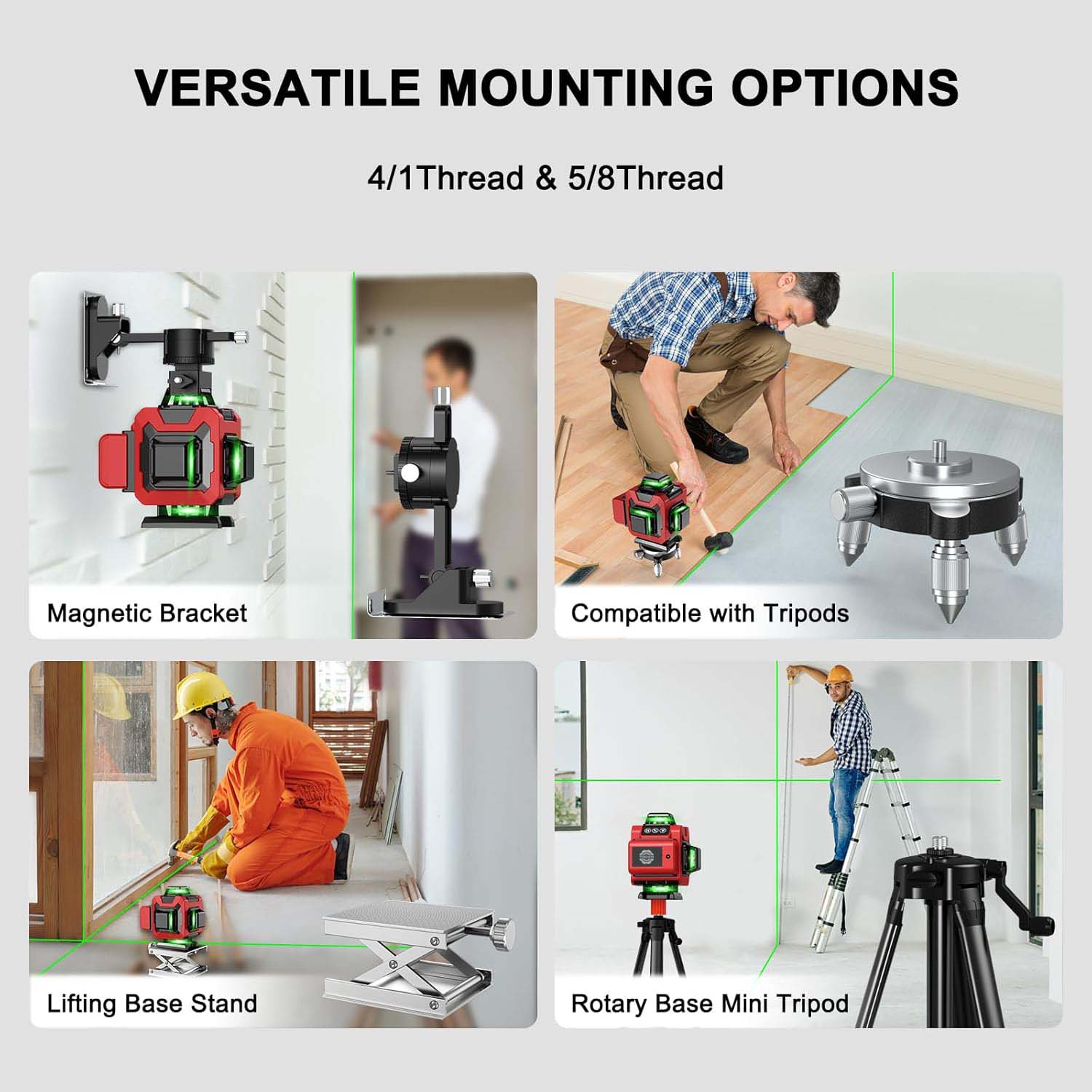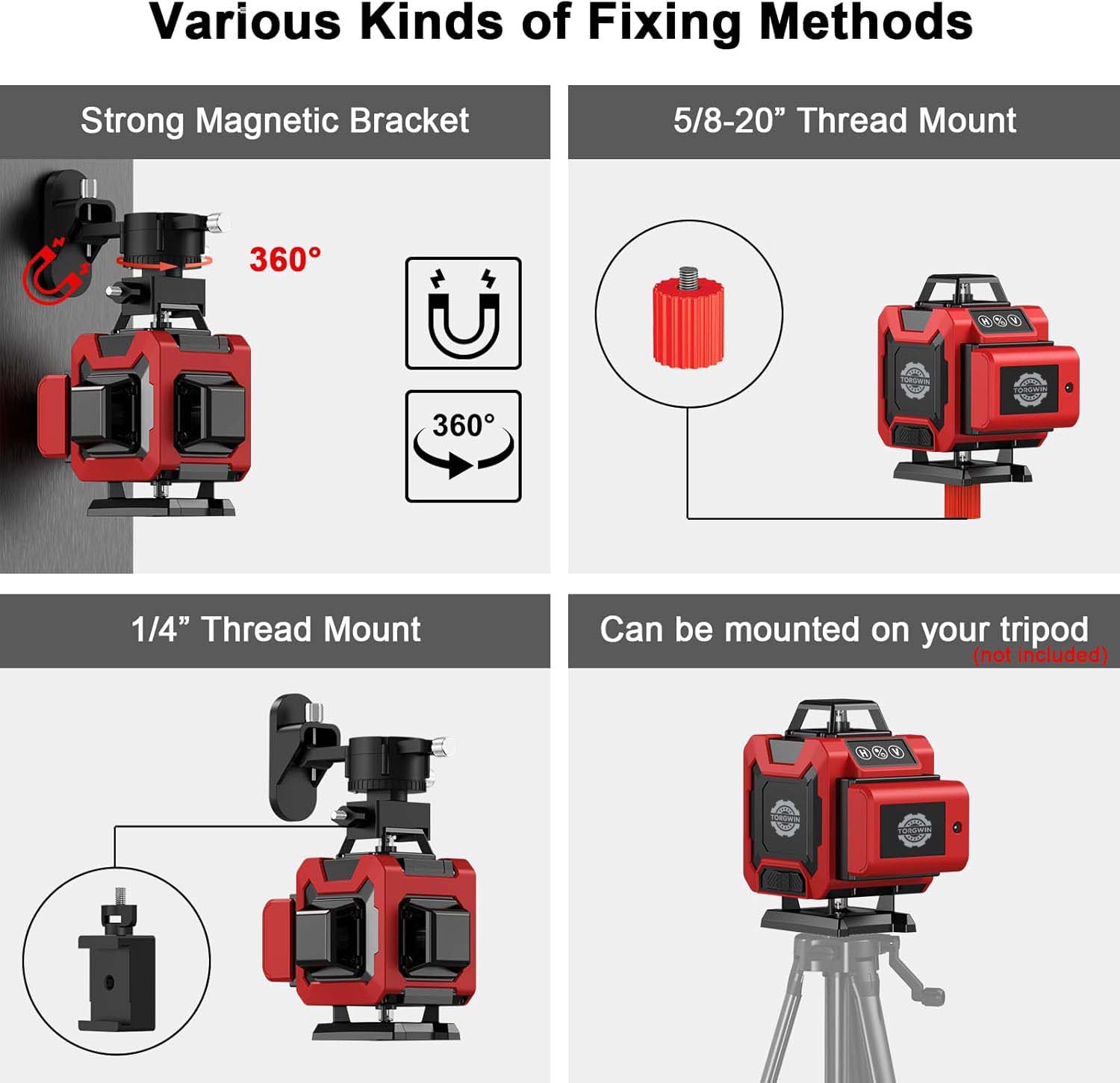 1. Įvairūs tvirtinimo būdai:Jame yra stiprus magnetinis laikiklis, kuris suteikia stabilų ir patogų lazerio nivelyro fiksavimo būdą daugelyje situacijų. 5/8–20" sriegio laikiklis leidžia prijungti prie konkrečių įrenginių ar konstrukcijų su tokio tipo sriegiu. 1/4" sriegio laikiklis taip pat siūlo kitą montavimo variantą, padidinantį jo suderinamumą su įvairiais priedais.